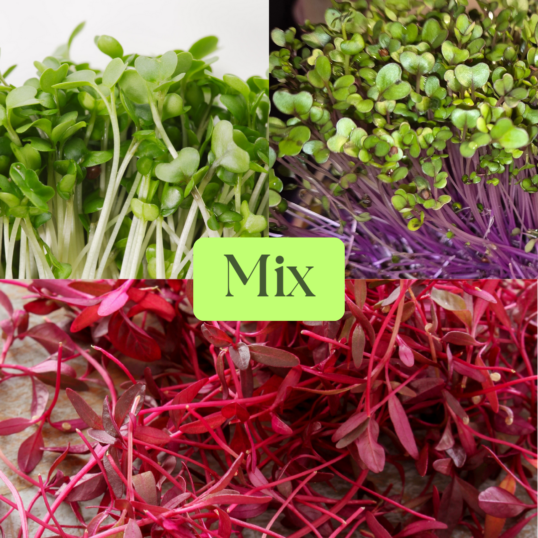Experience a vibrant and well-balanced mix of microgreens: Daikon Radish, Pink Kale, and Amaranth. Each variety contributes its own unique look and flavour: Daikon brings crisp white stems and spicy brightness, Pink Kale adds soft green leaves with a blush of pink and a mild, nutty taste, while Amaranth finishes the blend with its fine red threads and subtle earthiness.